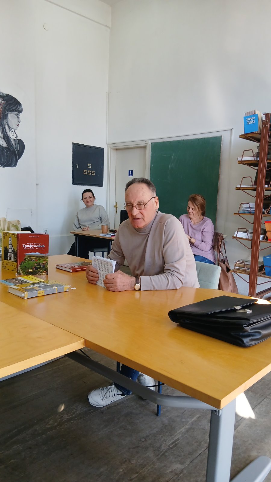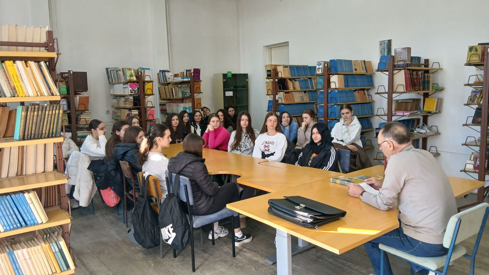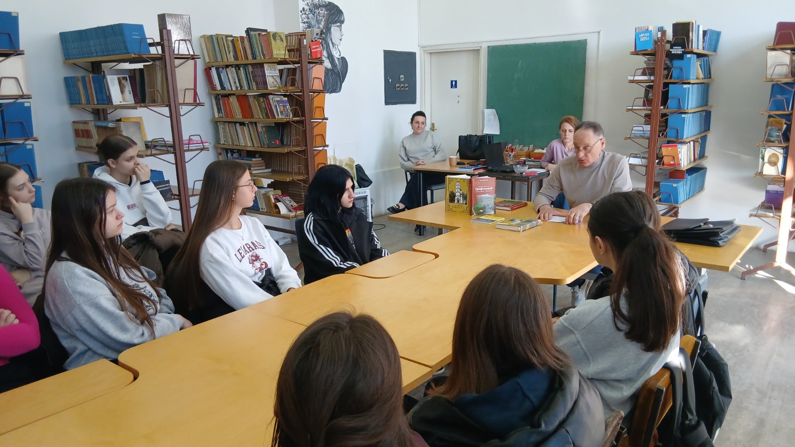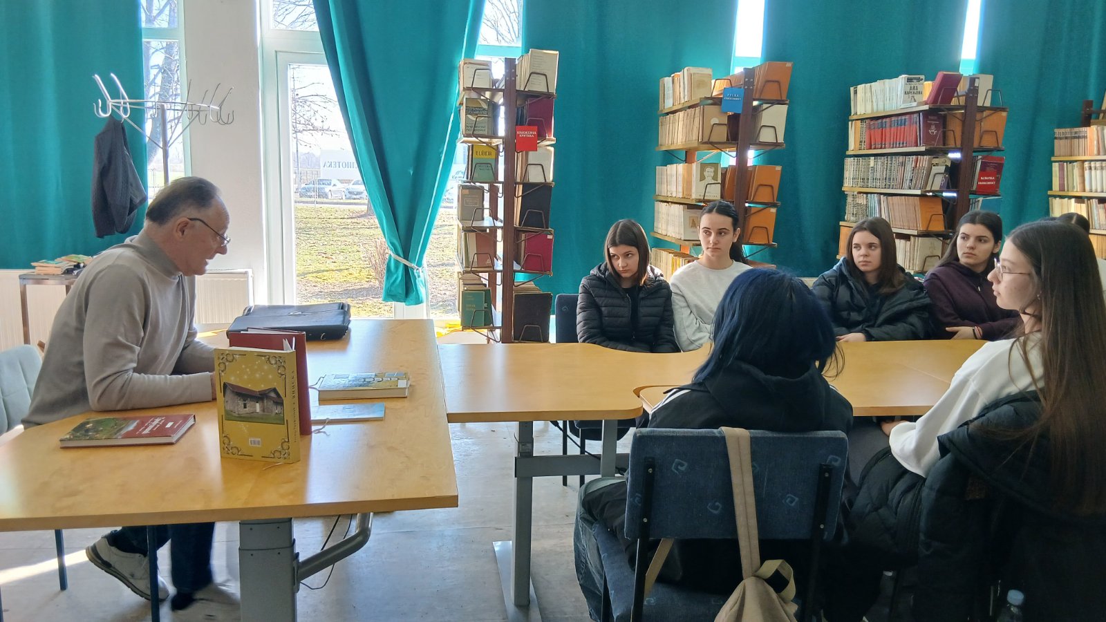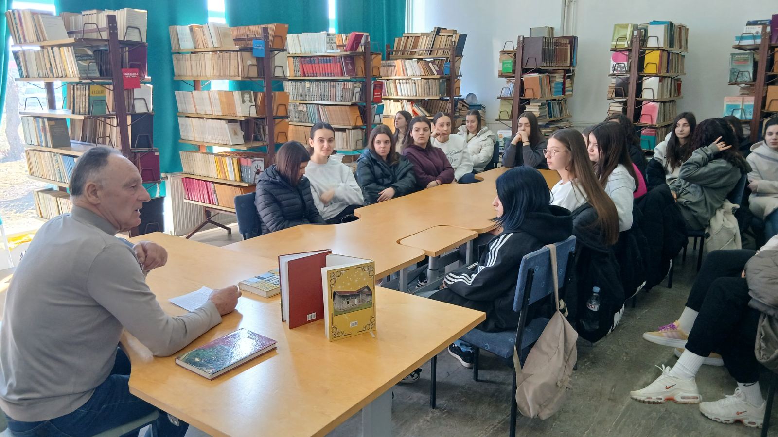У сриједу, 18. фебруара, у библиотеци школе угостили смо нашег професора Теодора Трифуновића. На позив библиотекара школе Сање Јаћимовић, професор Теодор се радо одазвао овом позиву те пред гимназијалцима одјељења II5 и IV1 причао о својим књигама, свом раду и стваралаштву. На занимљив начин, како то само професор Теодор зна, говорио је ученициа како су настајале његове књиге те шта га је подстакло да крене са једним захтјевним послом а то је прикупљање грађе за издавање његове монографије о селу Винска и родослова породице Трифуновића.