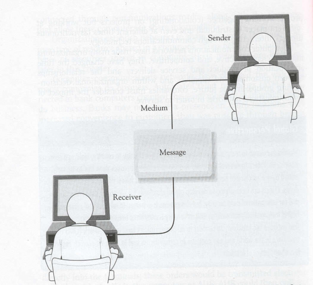 Poruka je ono što se prenosi između pošiljaoca i primaoca. U kontekstu podatkovne komunikacije, poruka je predstavljena grupom bitova. Pošiljalac, ili transmiter, je onaj koji emituje poruku. Primalac je onaj koji konačno prima poruku. Medijum je ono preko čega se poruka prenosi. Kao i među ljudima, komunikacija među računarima se ostvaruje samo ako primalac razume poruku pošiljaoca.