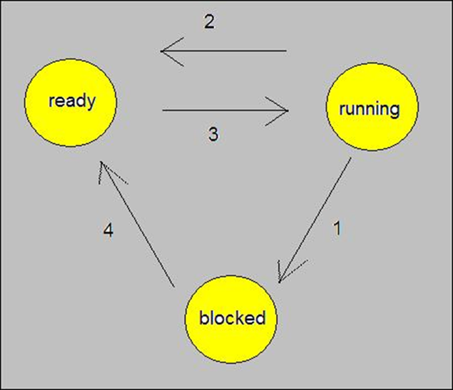 - proces prelazi iz stanja BLOKIRAN u stanje SPREMAN, kada dođe do potrebnih resursa i spreman je za dalji rad, ali procesor trenutno nije slobodan, pa prelazi u listu čekanja (npr. skener je završio skeniranje, i sad proces može nastaviti sa radom (spreman je), ali procesor je trenutno zauzet izvršavanjem nekog drugog procesa, pa mora da čeka u redu… )