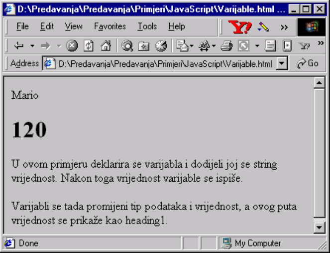 <p>Varijabli se tada promijeni tip podataka i vrijednost, a ovog puta vrijednost se prikaže kao heading1.</p>