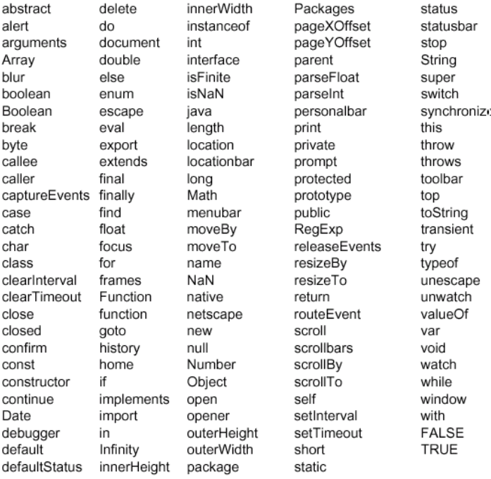 Postoje brojne riječi koje su sastavni dio JavaScript jezika. Te riječi nije dopušteno koristiti za nazive varijabli i funkcija jer interpreter ne bi bio u mogućnosti razaznati šta je izvorna naredba jezika, a šta varijabla ili funkcija.
