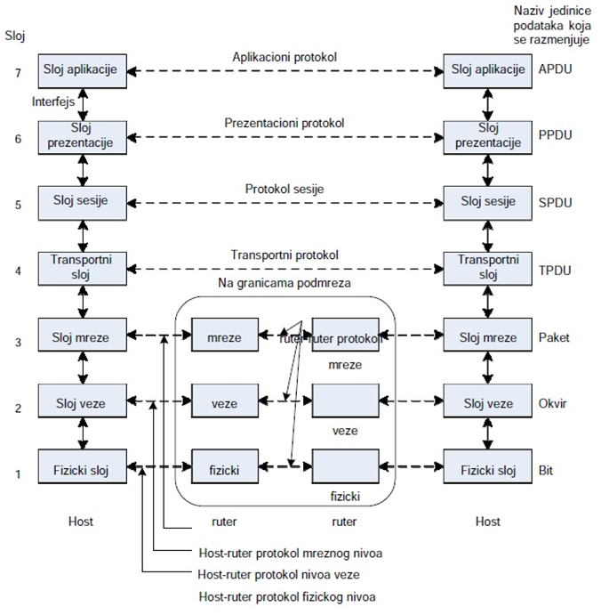 OSI model prikazan je na slici. OSI je standard uveden 1983. godine od strane međunarodne organizacije za standardizaciju (ISO – International Standard Organization). Njegovo ime, OSI (Open System Interconnect) referentni model, ukazuje da se radi o modelu povezivanja otvorenih sistema, odnosno sistema koji su otvoreni za komunikaciju sa drugim sistemima. OSI nije protokol, već opšti model za razumevanje i razvoj fleksibilnih, robusnih i otvorenih mrežnih aritektura.