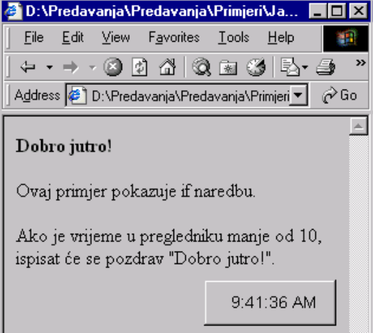 • Ovaj primjer pokazuje if naredbu.<p>Ako je vrijeme u pretraživaču manje od 10, ispisaće se pozdrav “Dobro jutro!”.