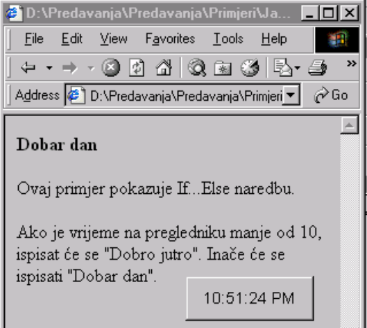 • Ovaj primjer pokazuje If…Else naredbu.<p>Ako je vrijeme na pregledniku manje od 10, ispisat će se “Dobro jutro”. Inače će se ispisati “Dobar dan”.