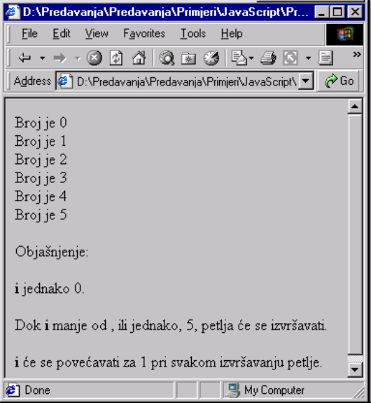 - { document.write(“Broj je ” + i); document.write(“<br />”);