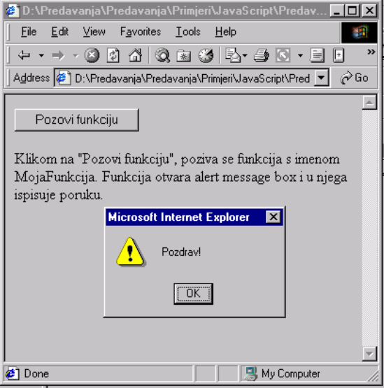 - <p>Klikom na “Pozovi funkciju”, poziva se funkcija s imenom MojaFunkcija. Funkcija otvara alert message box i u njega ispisuje poruku.</p>