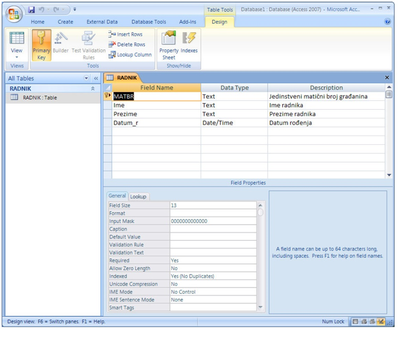 Da bi pristupili kreiranju tabele potrebno je odabrati tab (karticu) Create, a zatim alat za definisanje tabele Table. Nakon toga pojaviće se odgovarajući alat u centralnoj radnoj površini pomoću koga se može izvršiti definicija polja (drugim riječima atributa). Potrebno je odrediti ime polja (Field Name), tip podatka koji će biti memorisan (Data Type) i opciono opis tog polja radi pojašnjenja korisniku koji bude radio sa bazom (Description). (Taj opis će se pojaviti u statusnoj liniji forme nad datom tabelom kada se uđe u ažuriranje vrednosti tog polja). Na drugoj slici vidi se definisanje (u Design View-u) tabele RADNIK, tj. njenih polja.