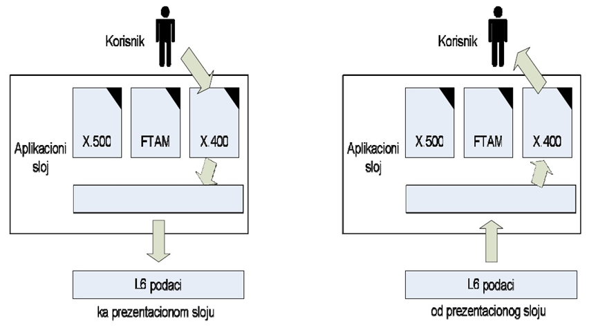 Na slici je prikazan odnos između korisnika, sloja aplikacije i prezentacionog sloja. Od brojnih aplikacionih servisa, slika prikazuje samo tri: X.400 (servis za razmenu poruka), X.500 (servis direktorijuma) i FTAM (prenos, pristup i menadžment fajlova). (Napomenimo da se radi o servisima OSI standarda, koji se danas rijetko koriste.)