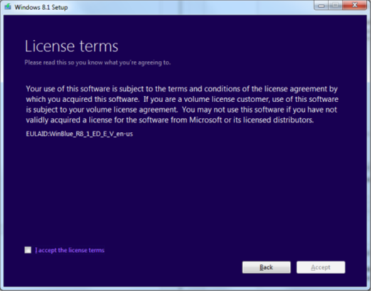 Nakon odabira željene opcije i klikom na dugme next, automatski će se provjeriti da li hardver računara podržava instalaciju WINDOWS 8 operativnog sistema. Ukoliko podržava pojaviće se ekrana na Slici 3. na kome treba da potvrdite da se slažete sa uslovima korišćenja.