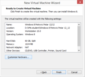 Nakon klika na dugme Next dobijate završni prozor na kome možete pročitati spisak podešavanja koja ste izabrali u prethodnim koracima. Ukoliko želite da zadržite ta podešavanja potrebno je da kliknete na dugme Finish, kako bi završili sa kriranjem virtuelne mašine (Slika 8.).