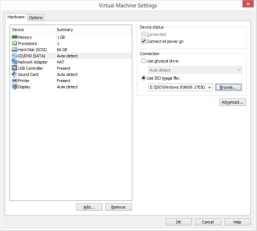 U dijelu CD/DVD (SATA) treba izabarti fajl pomoću koga ćete isntalirati operativni sistem na virtuelnu mašinu, Slika 11. Odabrati opciju Use ISO image file i klinuti na dugme Browse. Na lokaciji E:\ISO\Windows odabrati odgovarajući .iso fajl (Slika 12.).