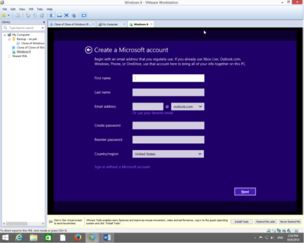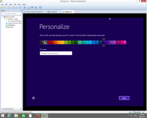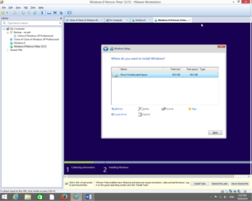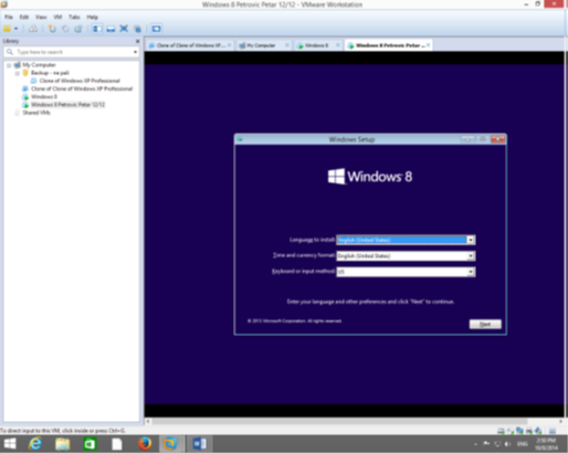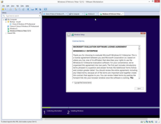 Pristupićemo sada instaliranju potpuno nove instalacije WINDOWS 8 operativnog sistema na virtuelnoj mašini. Prije instaliranja potrebno je da se isključe svi antivirusni programi, jer oni mogu da prave probleme prilikom instalacije. Proces instaliranja operativnog sistema zahtijeva direktni pristup hard disku (posebno obratite pažnju na antivirusni program pokrenut iz BIOS setup-a).