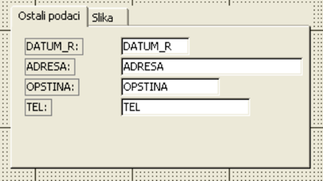 Kada „nacrtamo“ tu kontrolu na formi, onda prostom tehnikom Cut – Paste sa forme preselimo na Tab Control željene Text Box –ove.