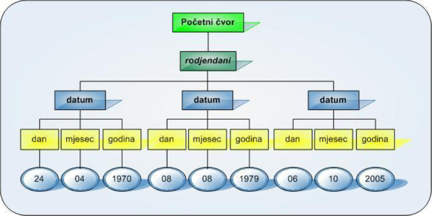 Početni element rođendani sadrži svoje direktne potomke, a to su elementi datum. Svaki od elemenata datum sadrži svoje pripadajuće elemente dan, mjesec, godina. Svaki od tih elemenata ima pripadajući čvor koji sadrži vrijednost samog elementa (čvorovi na dnu prikazanog XML stabla).