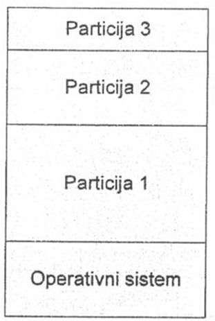 Upravljanje memorijom pomoću statičkih particija je jedan od najosnovnijih načina upravljanja memorijom. Za višeprogramski rad neophodna je dodjela više particija. Memorija se dijeli u particije fiksne veličine, kao što je to pokazano na slici 1. Particije su fiksirane u vrijeme inicijalizacije sistema i ne mogu se mijenjati u toku izvršavanja programa. Svakoj particiji se dodjeljuje po jedan proces. Programi se raspoređuju tako da budu smješteni u najmanjoj particiji koja je dovoljno velika da prihvati cio program. Izvršni program koji je pripremljen za izvršavanje u datoj particiji ne može da se izvršava u nekoj drugoj particiji bez ponovnog povezivanja (eng. relinking).